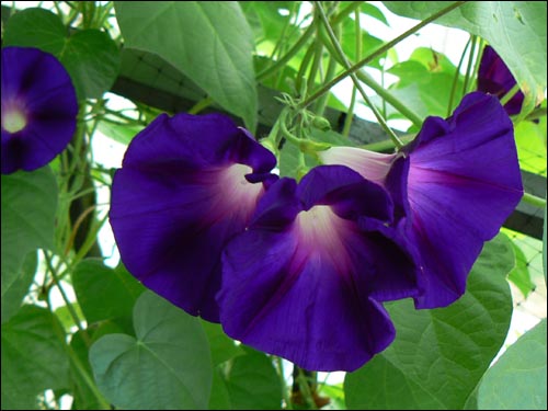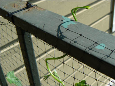 One of the Candy Pink vines finally reached the top of the railing, so I supposed it was time to do something about the top half of the opening. I moved some of the hanging baskets around, and built a "harp" of strings for them to climb on. They've really accelerated their growth now that they've got some real leaves on them, and gotten established on the sunny side of the railing. I'm guessing that it won't take long for them to make it to the top of the strings and start filling out.