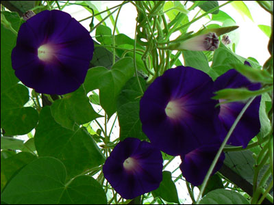 5 July 2007 - The vines are coming along fairly well, and have filed in a lot lately. The Star of Yelta vines have produced a ton of flowers, most of which are now in the process of setting seeds. Because the satellite uplinks at work are affected by weather, most of which comes from this direction, I've upped the refresh rate to once every five minutes, so the BeanCam can act as sort of an "early warning system" as the rain approaches. I'm also experimenting with some weather data. Pointing a camera at a thermometer display is hardly the "right way" to do it, but I had an extra camera feed that I wasn't using, so I figured I'd throw together a "quick and dirty" solution to give it a shot. Also, I finally got rid of the little dead rock pine tree that's been sitting in the planter all this time, and replaced it with some more morning glories that have been too big for their pot for a while.