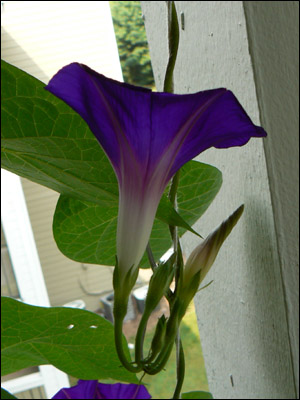 One of the Candy Pink vines finally reached the top of the railing, so I supposed it was time to do something about the top half of the opening. I moved some of the hanging baskets around, and built a "harp" of strings for them to climb on. They've really accelerated their growth now that they've got some real leaves on them, and gotten established on the sunny side of the railing. I'm guessing that it won't take long for them to make it to the top of the strings and start filling out.